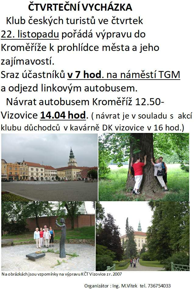 Ráno 22.11.18 odjezd autobusem z Vizovic za pošmourného počasí. Vlivem zácpy na silnici do Zlína jsme nestihli přestup na další autobus a tak jsme pokračovali vlakem. Mžilo, ale nepršelo. Procházeli jsme se po městě a naším cílem byly pomníky osvobození Kroměříže Rumunskou armádou. Rumunsko v tomto roce také slavilo 100 let osvobození od nadvlády Habsburků. Zašli jsme i do zoologické zahrady v podzámčí a naši návštěvu jsme ukončili dobrým obědem v hospodě na náměstí. Bylo nás 5 a výlet jsme hodnotili kladně. Nazpět jsme se vrátili přímým vlakem.