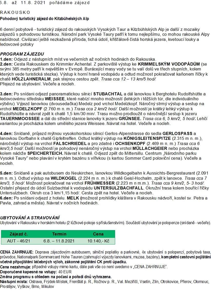 7.7. 2021 ve středu od 14 do 16 hod. na KD budeme vybírat doplatek na KITZBUHELSKÉ ALPY a to 5 140,- Kč.